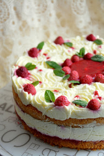 Obruč za torte obložite prozirnom folijom i stavite ga oko donje kore torte. Na koru pažljivo stavite 2/3 kreme u više malih hrpica- da se ne pomješa sa malinama. Sad stavite gornju koru tako da maline budu do kreme. Ja obično brzo okrenem koru tako da mi dio natopljen malinama bude na dlanu i onda je spustim na kremu. Ostane nešto malina na dlanu- ali to i nije neki problem ;)